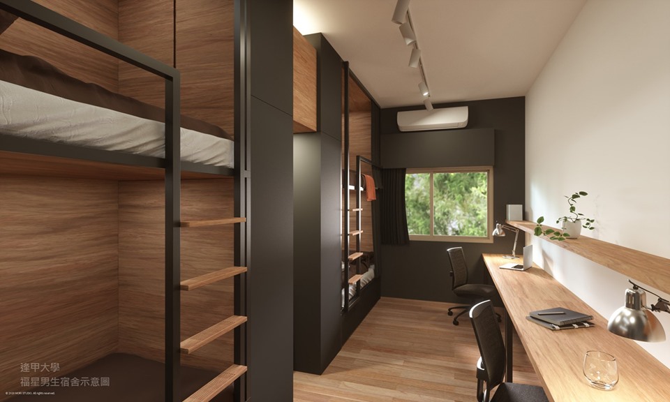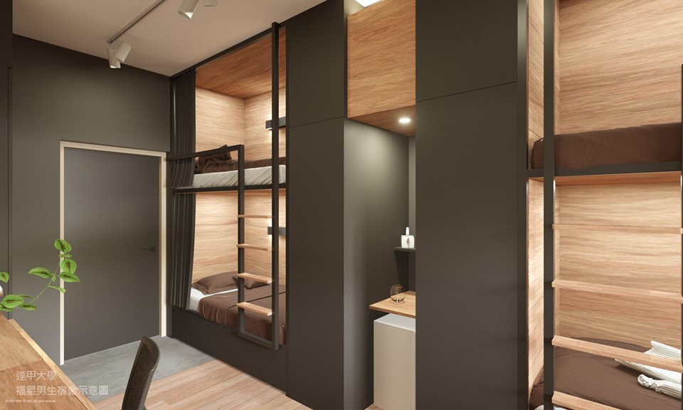 ▼福星男生宿舍預計在今年8月正式完工,9月份開學後,學生們就能入住新宿舍了。與很多大學的宿舍一樣,房間中有4個單人床,採用上下舖設計,但大面積的原木裝潢,再加上鐵灰色的牆面,看起來簡約時尚。