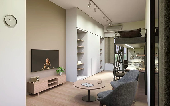 ▼宿舍中的置物櫃與床相結合,並不突兀。最誇張的是房間中還有一個小冰箱!