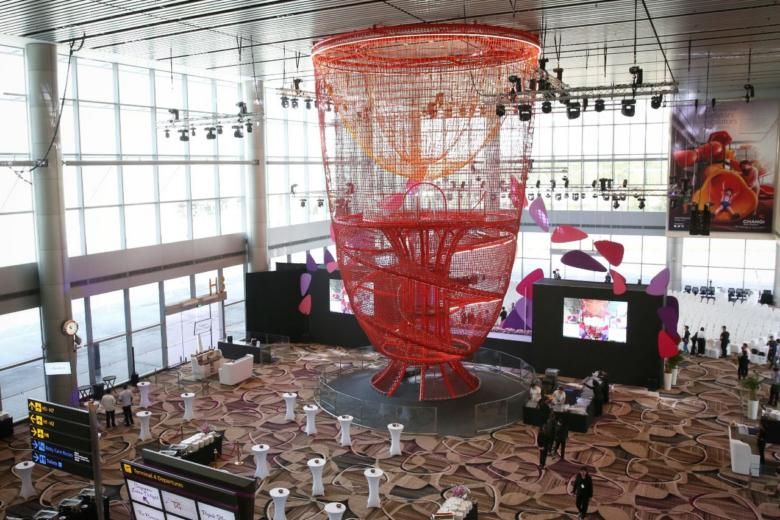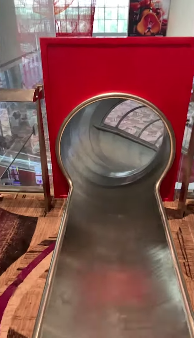 ▼他表示:「我從沒看過這樣的設施,而且它竟然是真的!」溜滑梯的速度很快,一到底部就會看到樟宜機場的巨大紅色吊燈,省去不少上下樓的移動時間。