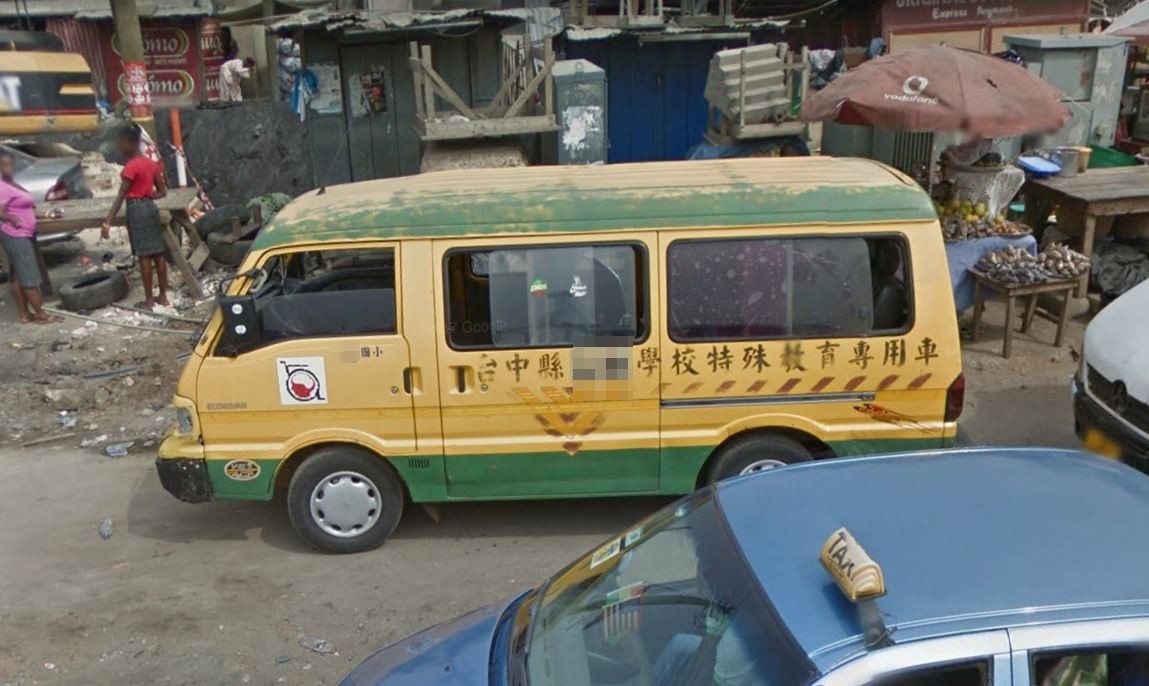 ▼網友在滑Google街景圖時,注意到非洲迦納首都「阿克拉」有一輛台灣的娃娃車,熟悉的黃色車身上還印著「台中縣XX學校特別教育專用車」,而台中縣更是在2009年就已經廢止的行政區。
