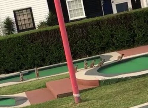 ▼狐獴混入了遊客群裡,在道路上逛街,或與遊客對視。還有一小群直奔向迷你高爾夫的球池,在邊上曬太陽。