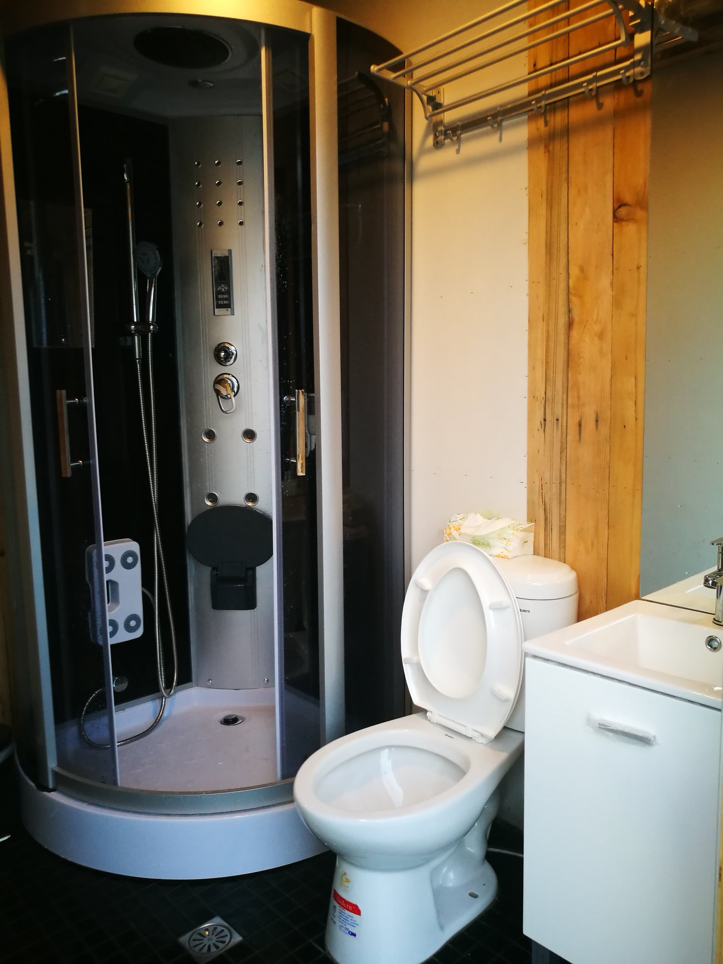 ▼帳蓬馬車內部沒有衛浴設備,但是在園區內有兩套共用衛浴區,看到這個衛浴設備,根本不會以為你是在荒野田地上洗澡呢!