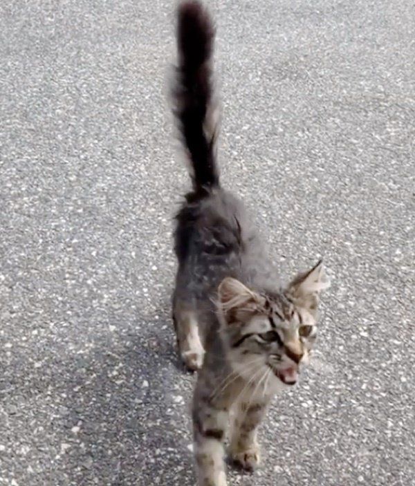 美國佛羅里達州女孩Kiara養了一隻狗狗,那天她外出遛狗時,竟然被一隻流浪貓盯上了。那隻貓咪無視高大的狗狗,直接走到她身邊,喵喵叫著打招呼。Kiara遛狗回來後,發現貓咪還在原地,好像在等她。