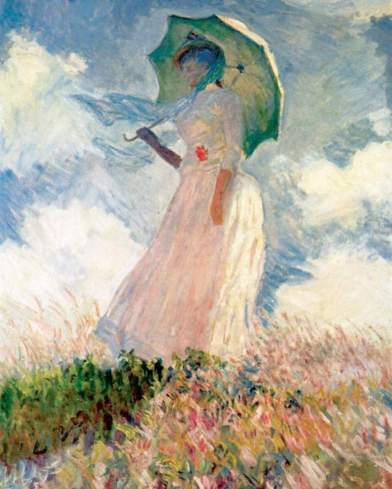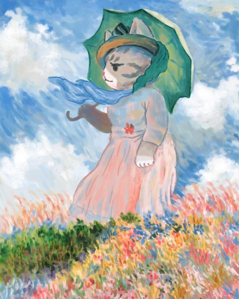 ▼莫內《撐傘的女人》:1875年時,莫內創作了這幅作品,原本畫中人是他的妻子,現在變成了貓咪。