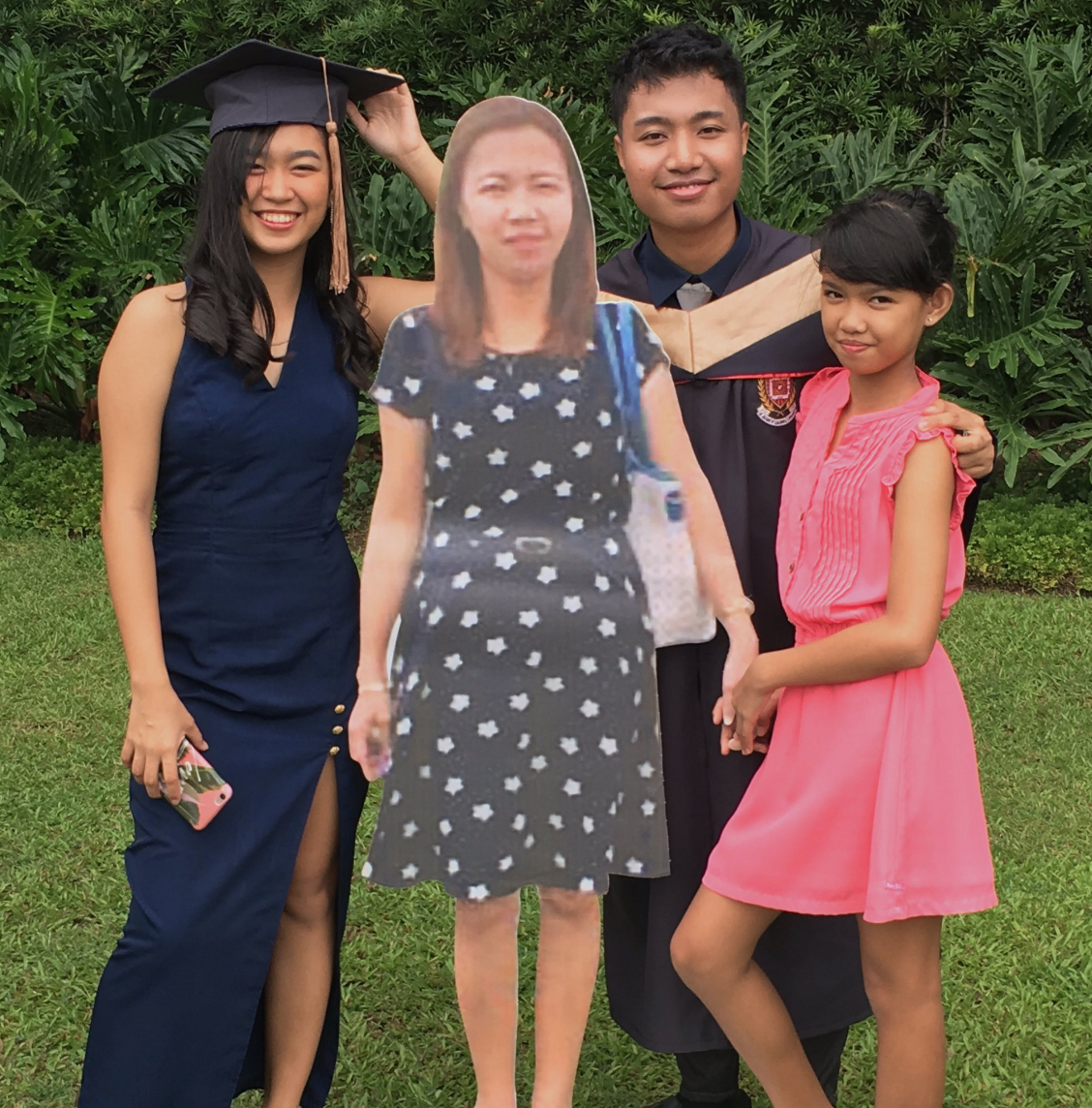 ▼「這個人形立牌可以讓我在畢業典禮上感受到我母親的存在」,Paulo那天不斷跟紙板媽媽拍照,家人當然也一起入鏡,彷彿媽媽從來沒有離開過。