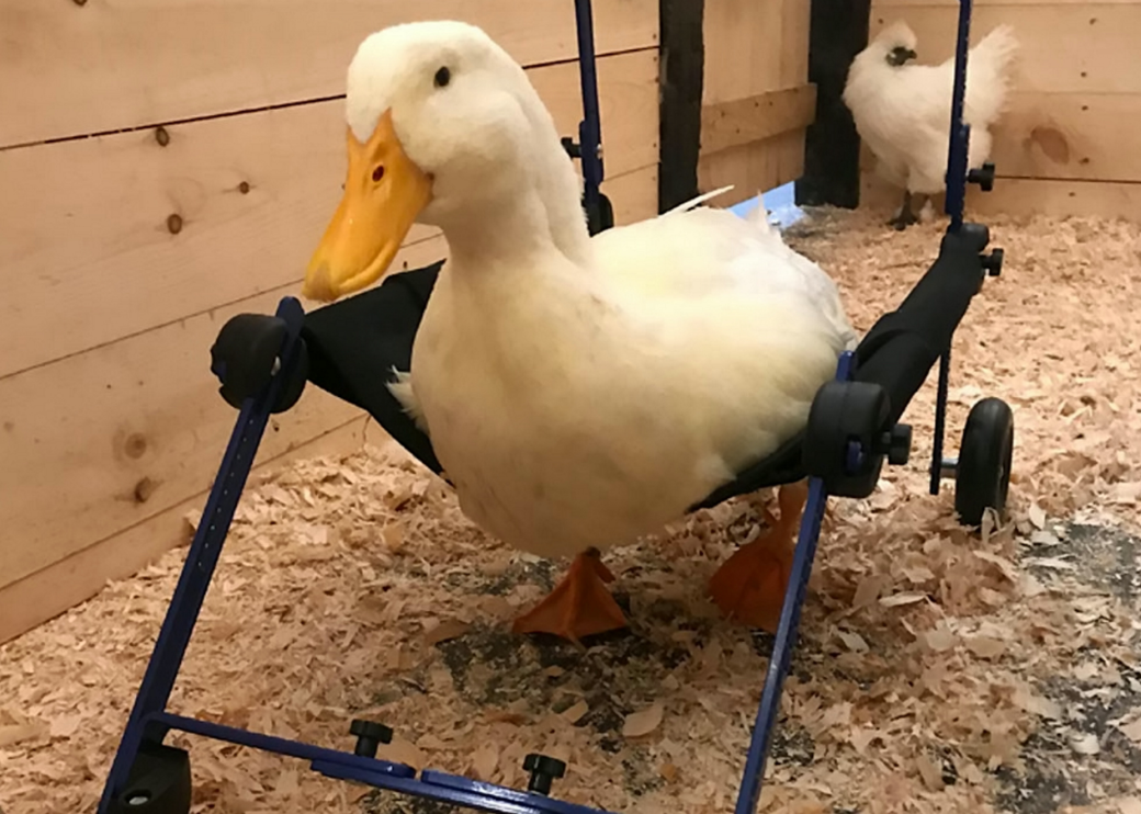 ▼今年初,美國紐澤西州一隻叫Merlin的小鴨子也因為輪椅受益。牠天生跛腳不能走路、游泳。專為動物打造助行工具的「Walkin'Pets'」公司為Merlin設計了一款小輪椅,讓牠能夠自由活動。