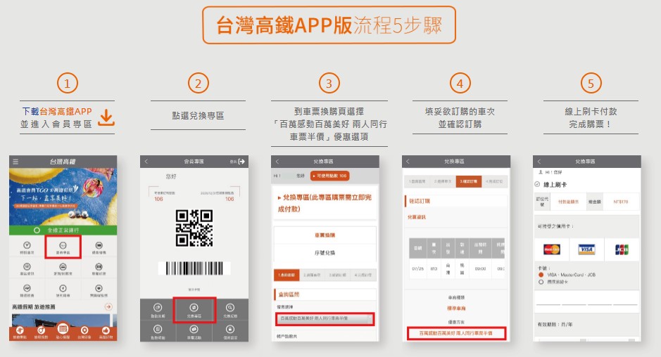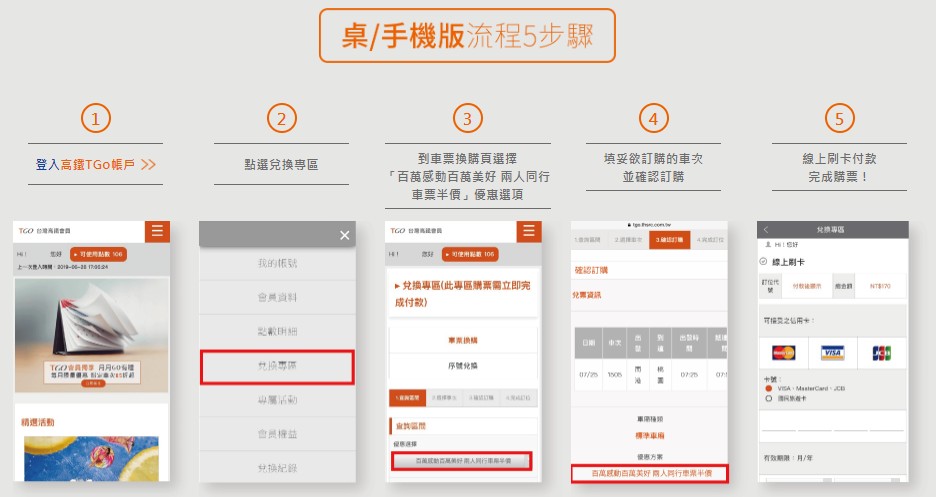 ▼在 7月22日晚間2230至2330期間,到「兌換專區」的「車票換購」頁面,選擇「百萬感動百萬美好 兩人同行車票半價」優惠選項,填妥起訖站、日期、車次,並立即完成線上付款,就能夠完成購票!
