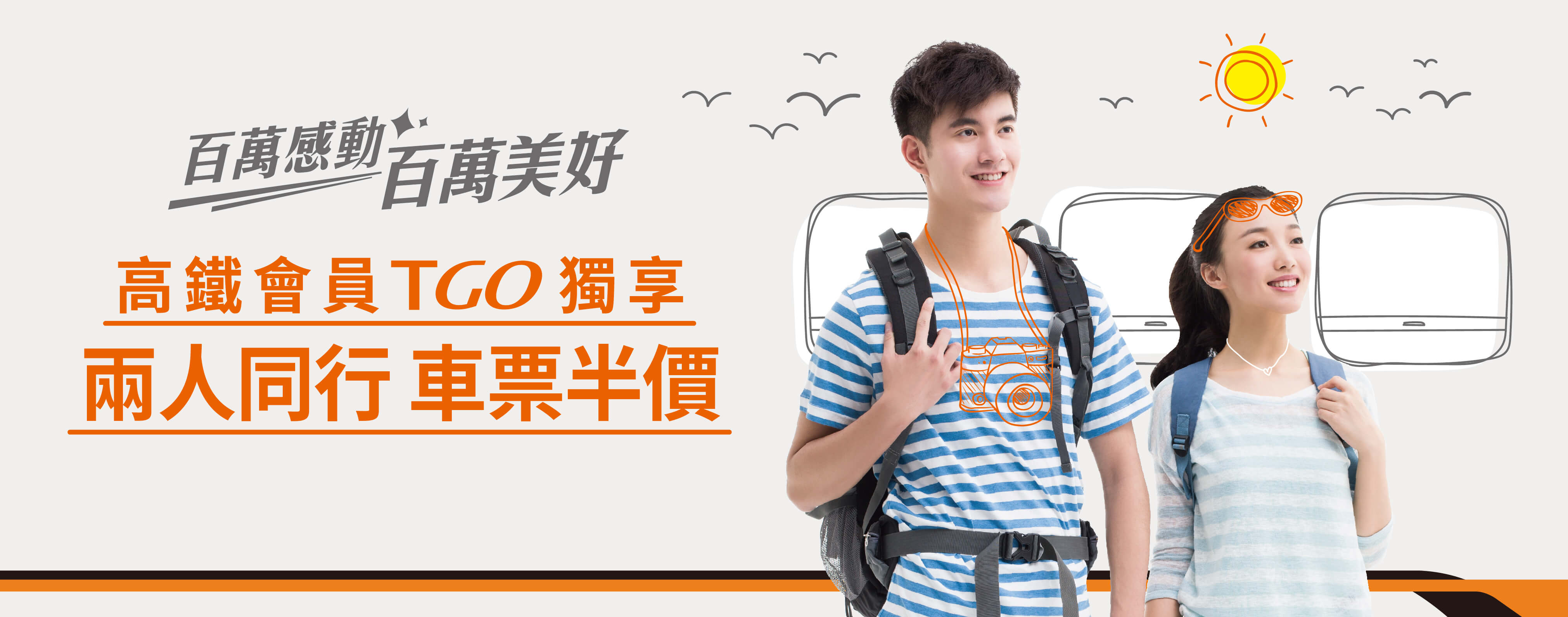2019年07月22日為了歡慶高鐵 TGo 會員人數超越百萬,台灣高鐵推出了 TGo 會員獨享的「百萬感動,百萬美好」限時促銷優惠,只要購買兩張票就可以獲得半價優惠,以高鐵票原價來算,相當高鐵票買一送一!這一次的優惠限量2500組,且售票時間只有1小時、售完為止!