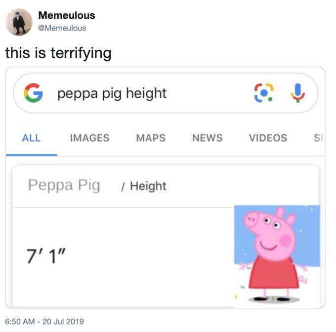 2019年07月25日佩佩豬(Peppa Pig)在小孩之間的人氣非常高,然而你可知道「粉紅豬小妹」一點也不小嗎?有網友一時好奇就去問Google「粉紅豬小妹」到底有多高,結果它給出的答案讓大家都以為眼睛出問題,身高竟然跟NBA球星差不多?!