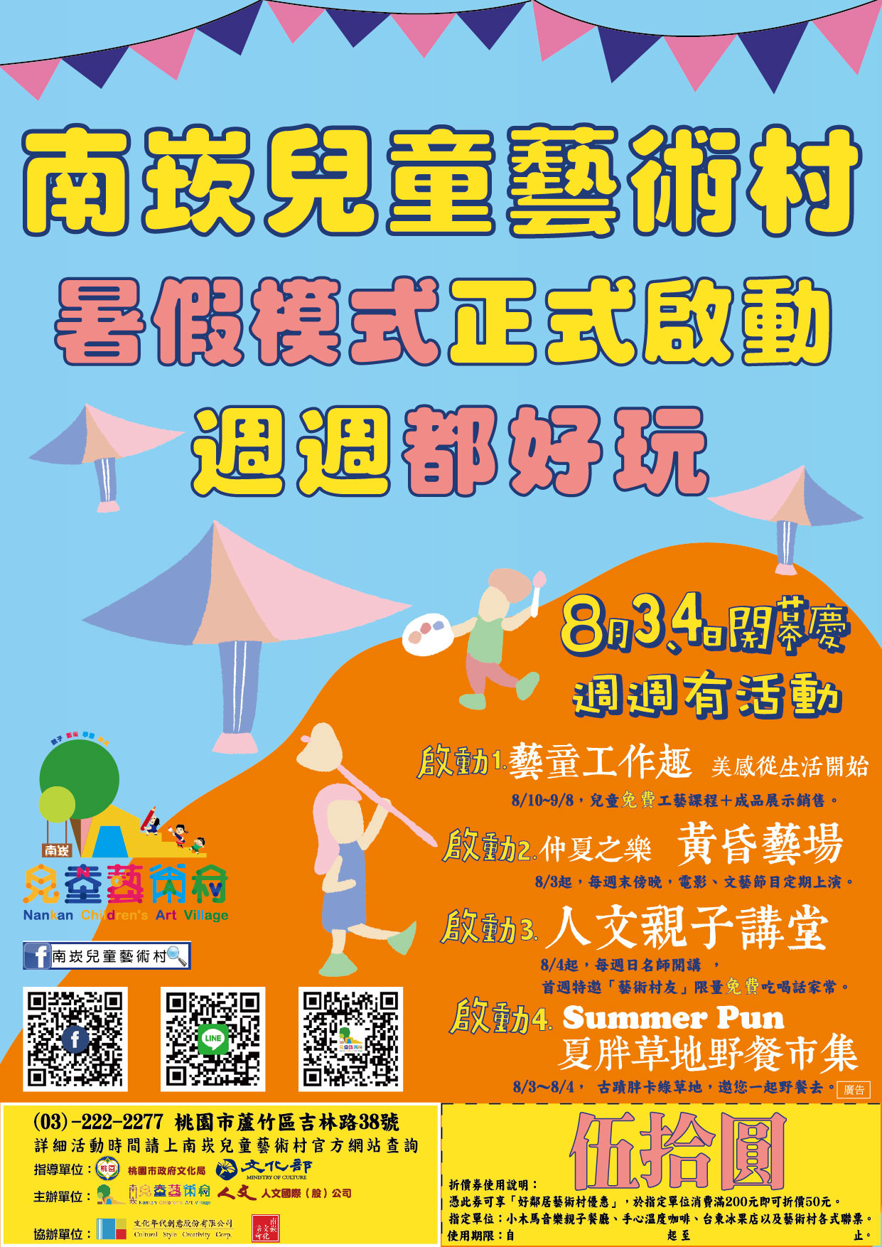 ▼而為了成功吸引民眾到訪南崁兒童藝術村,館方也精心規劃了一系列的活動,現場除了有「藝童工作趣」生活工藝創作坊帶領大小朋友一同體驗手作樂趣外,8月的每週六還有「仲夏之樂-黃昏藝場」安排電影欣賞與藝文節目;每週日則舉辦「人文親子講堂」邀請教育界、藝文界名師來開講,讓大小朋友都能吸收知識,滿載而歸。