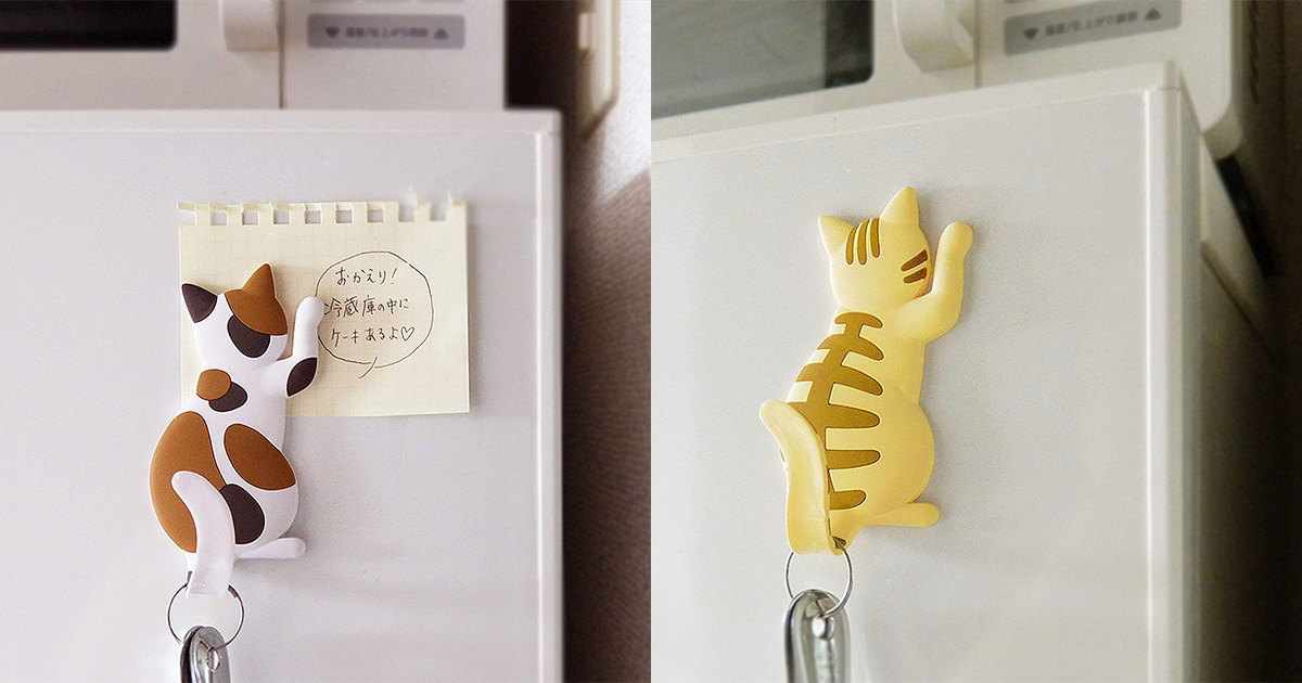 ▼快看這喵皇磁鐵+掛鉤,整隻巴在冰箱上不放,屁屁朝外、小尾巴就是拿來吊小物的,也太萌惹吧~
