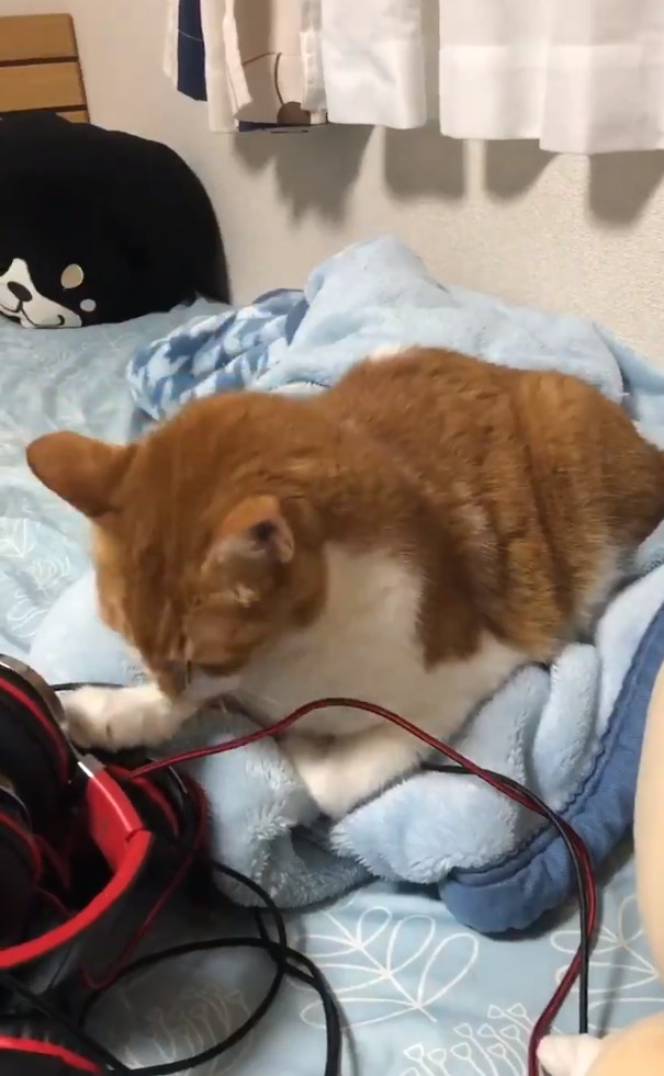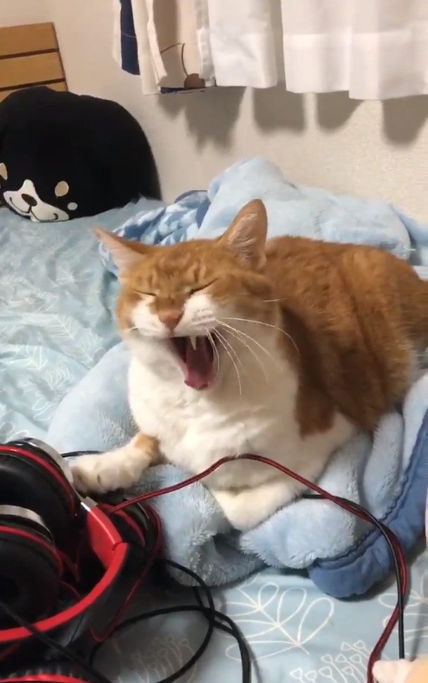 ▼貓咪安靜趴在床上,隨著震動一起搖晃,就像軟Q的布丁一樣。不僅如此,牠還低頭舔毛,並打了一個大大的呵欠。