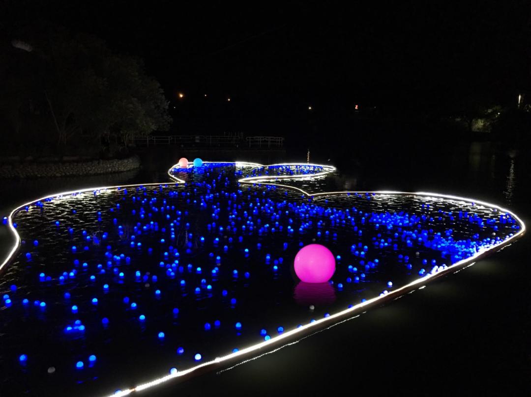 ▼除了浪漫的藍光河道之外,還有超夢幻的「魚耀隧道」以及「希望樹」燈光藝術裝置。全長有65公尺的魚耀隧道,在湖面的倒映下形成完整的一條魚,燈光變換出五顏六色的色彩,非常美麗~