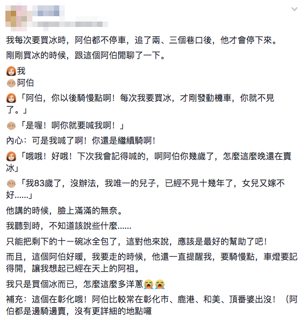 2019年08月09日深夜買冰竟然變買到大洋蔥⋯彰化一名女網友是一位賣冰阿伯的老主顧,近日下班後也特別跟阿伯買冰,閒聊之中得知阿伯已經83歲卻依然出來賣冰的原因,讓她忍不住就買下所有剩下的冰,讓阿伯早點回家。當她離開時,阿伯說的話讓她眼淚都快流出來⋯