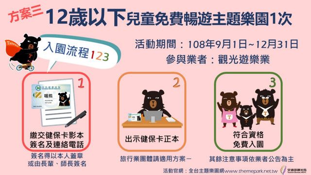 ▼「方案三:觀光遊樂業入園優惠」爸爸媽媽們想省錢帶小朋友出門就看他了!自由行遊客12歲以下兒童,不分平假日美人免費入園一次,入園只要繳交孩童健保卡影本,並簽名留下聯絡資料,就能免費入園囉!全台23間主題樂園皆適用,名單如下: