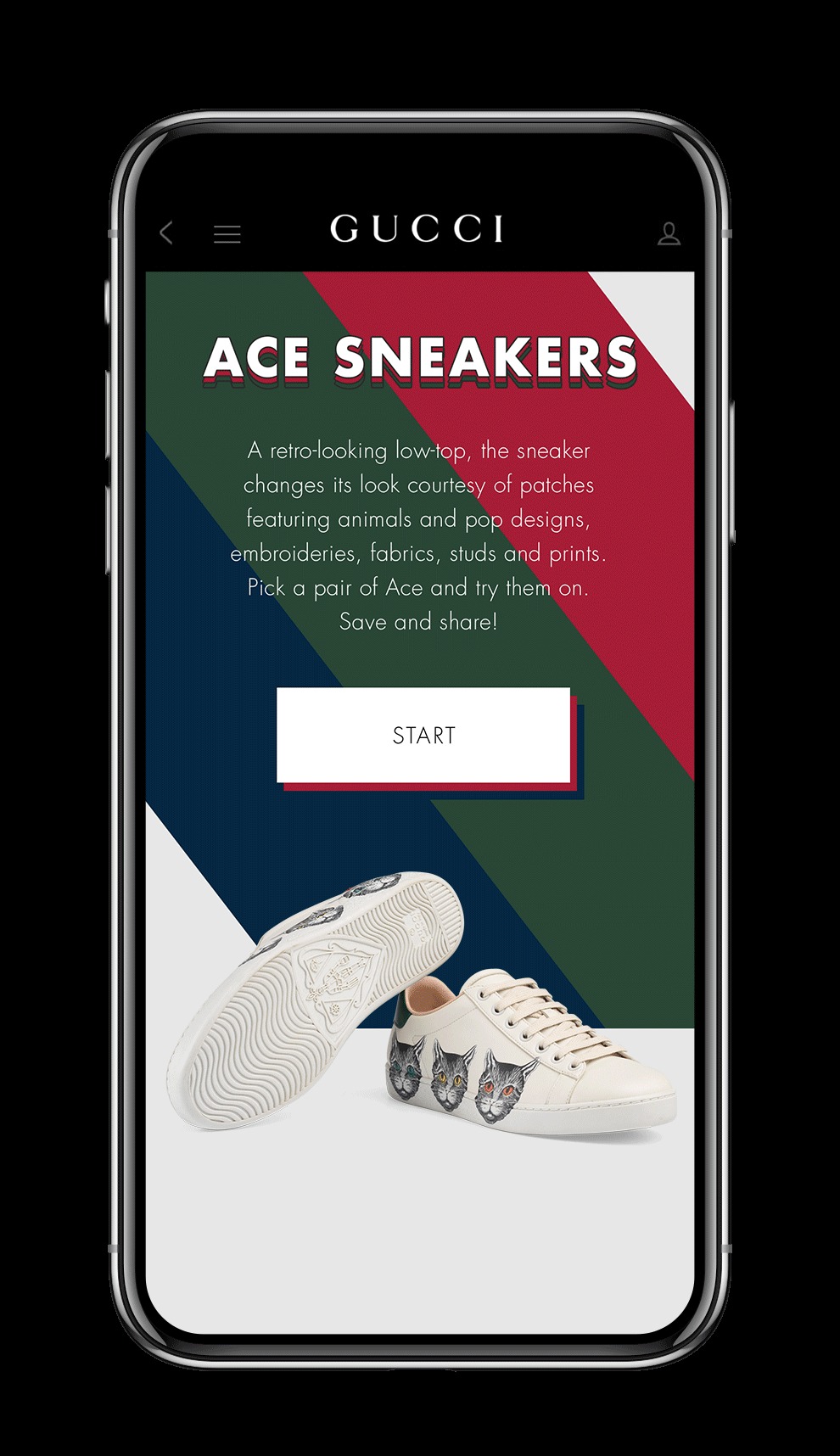 ▼在這款 Gucci 推出的虛擬試穿 App 當中,利用 AR 擴增實境技術,讓使用者可以使用虛擬試穿功能,看到各種不同款式的 Ace 球鞋穿在自己腳上的模樣!這個 App 除了令潛在消費者更加容易衝動消費之外,也讓人感受到了品牌的用心!