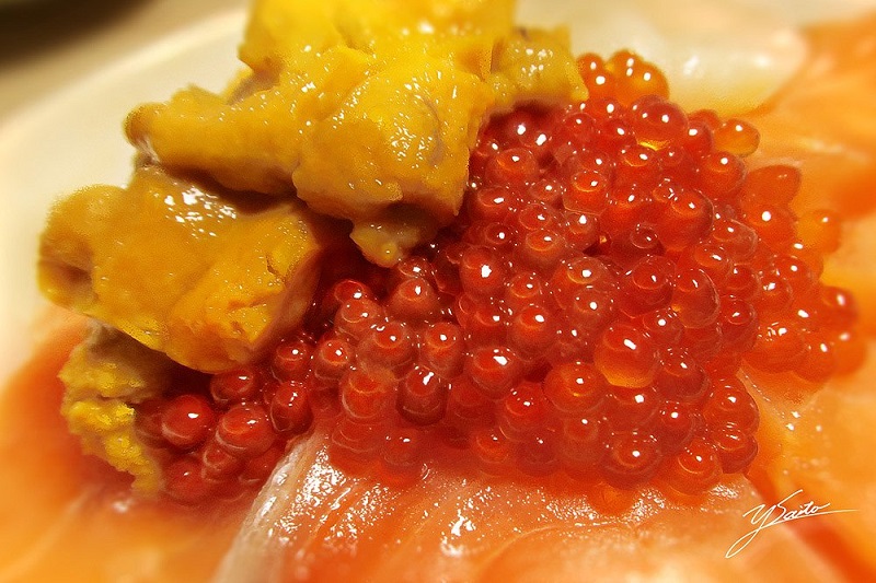 ▼看看這鮭魚卵,每一顆晶瑩剔透的模樣,讓人好想直接挖一口來吃!還有一旁的海膽和鮭魚生魚片,鮭魚肉上的油脂閃閃動人的樣子,不敢相信這是畫出來的!
