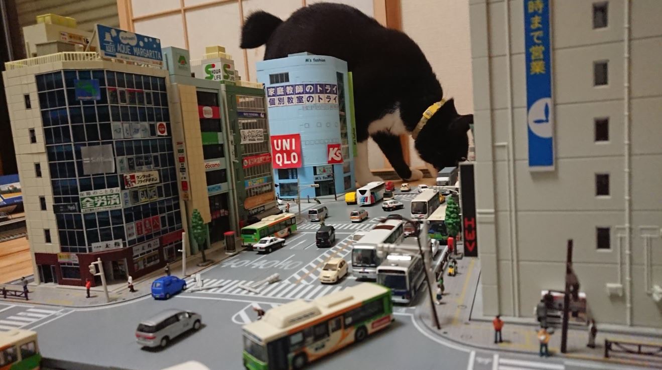 ▼這座城市模型非常精緻,高樓大廈、車輛行人應有盡有。但一隻貓咪卻突然跳上來,如同「喵斯拉」一樣在城市裡隨意漫步。