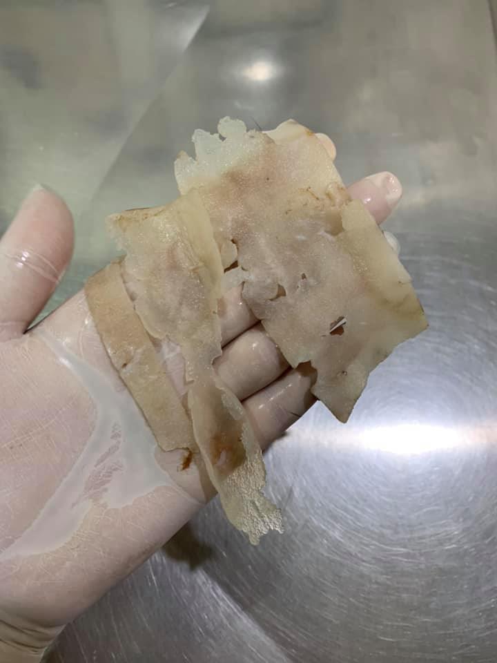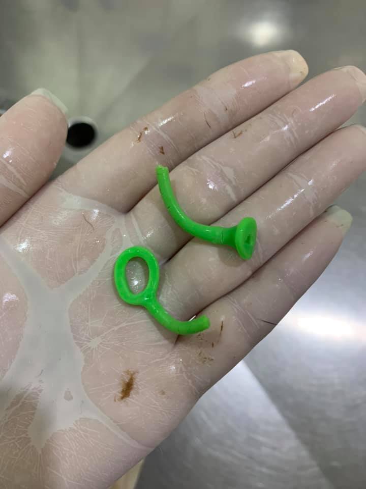 ▼結果照X光發現牠的肚子裡居然有一大堆的異物!獸醫馬上給予幫助後,居然從Devil的肚子裡取出32隻黃色小鴨、塑膠皮和綠色塑膠條!