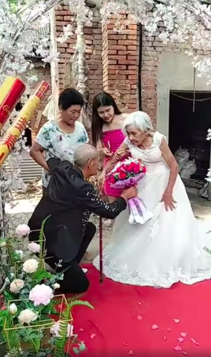 ▼阿公單膝跪地,將花送到阿嬤手中。他們已經攜手走過這麼多年頭,餘生也要相互陪伴啊。