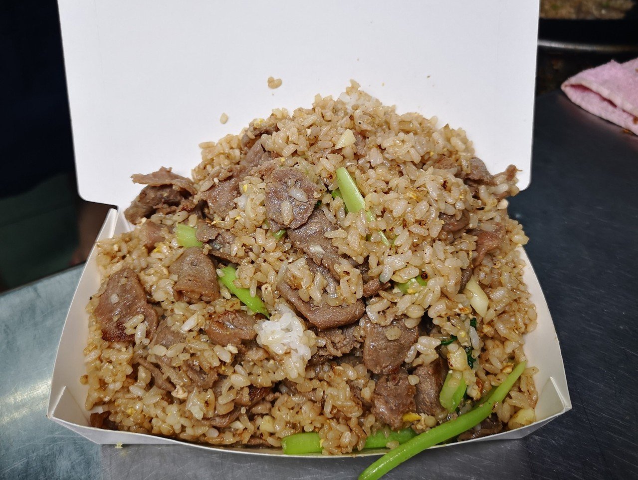▼炒飯裝紙盒甚至還蓋不起來,必須另外再拿袋子打包,一座「小山」的畫面超震撼!料多又實在,每一口都可以吃到羊肉!