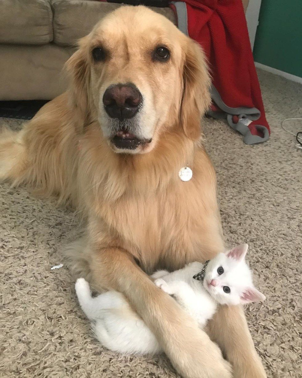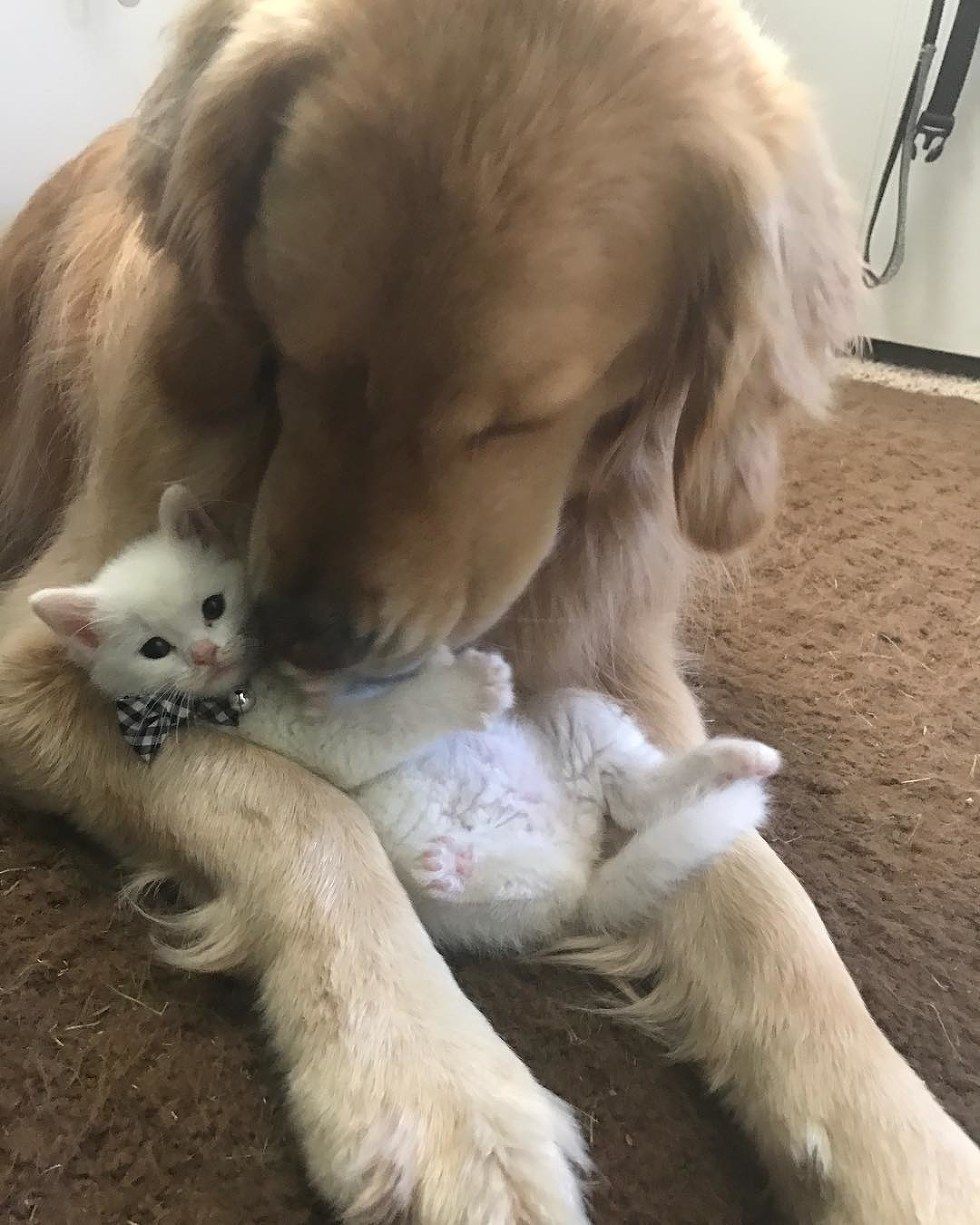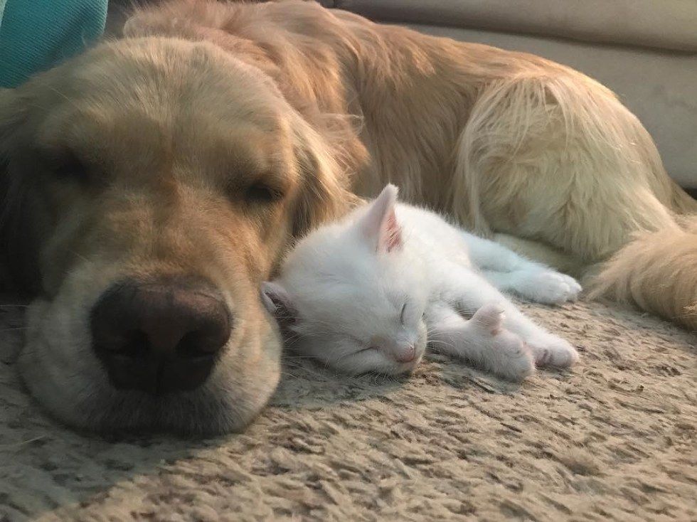 ▼Kim家中有一隻叫Mojito的黃金。剛開始他們非常擔心,怕Mojito不接受小貓。沒想到牠一下子就愛上了這個小傢伙:「牠上去親了小貓一下,小貓也不排斥。牠們很快就窩在一起了。」