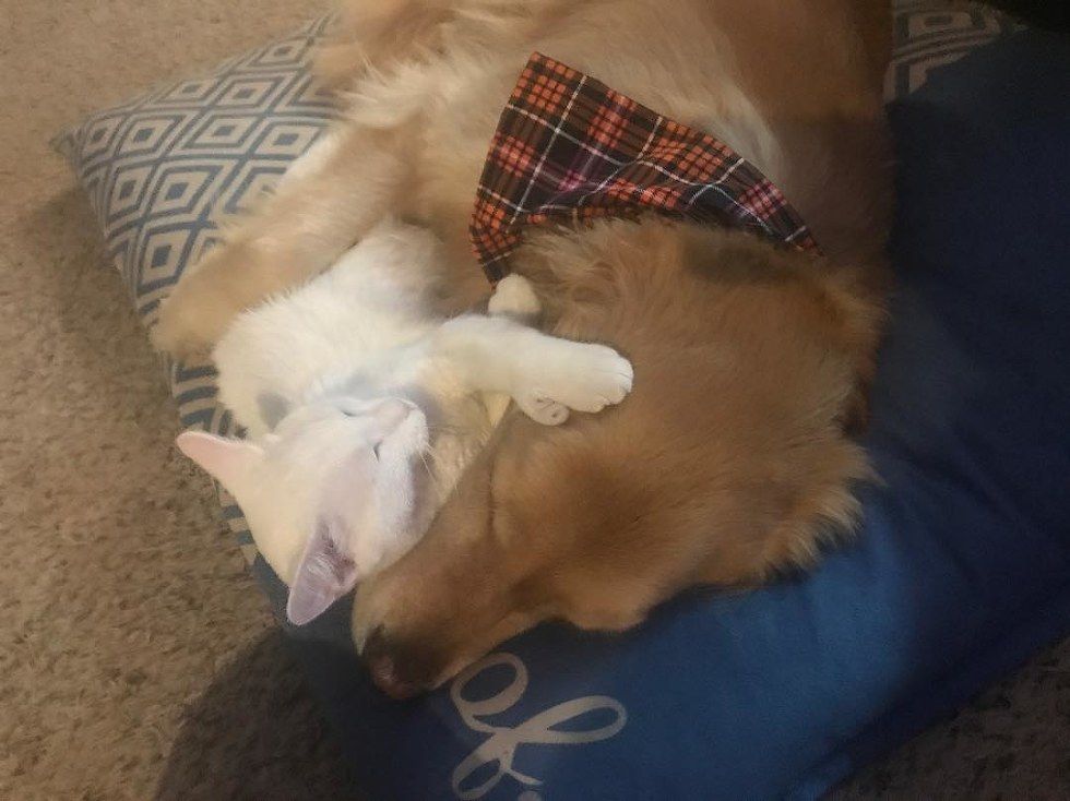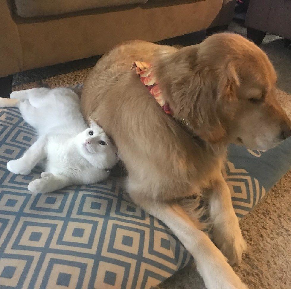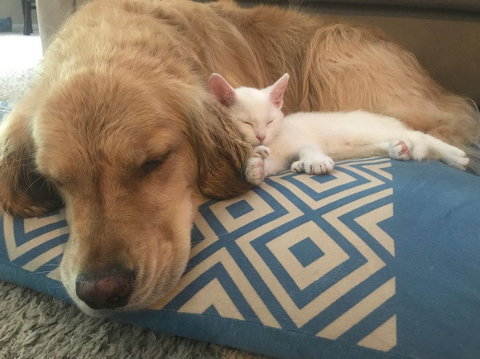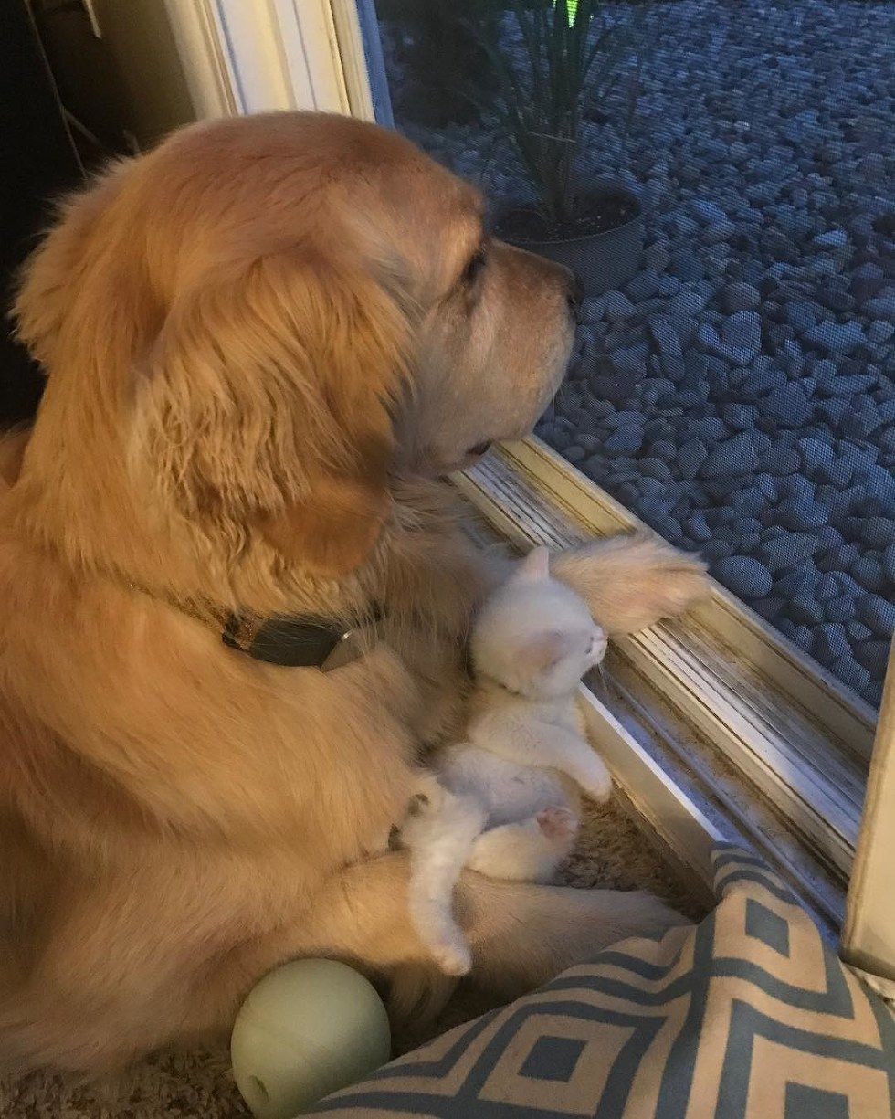 ▼Kim家中有一隻叫Mojito的黃金。剛開始他們非常擔心,怕Mojito不接受小貓。沒想到牠一下子就愛上了這個小傢伙:「牠上去親了小貓一下,小貓也不排斥。牠們很快就窩在一起了。」