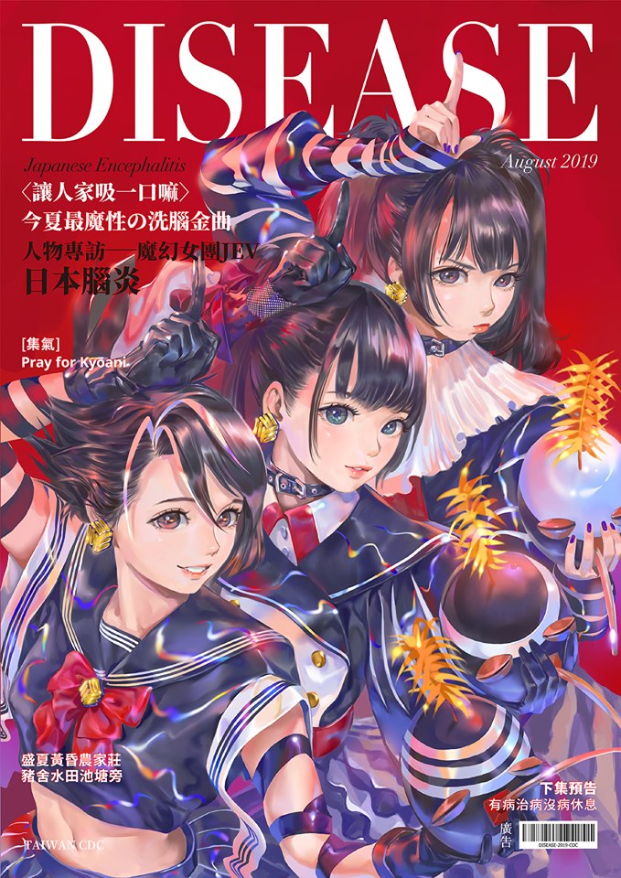 ▼而這些文宣會紅到日本的契機,是因為2019年8月這一期的人物是以3人女團的形象出現,而團員的名字分別叫做 Three(三)、環和 Shiro(白),分別對應導致的蚊子:三斑家蚊、環紋家蚊及白頭家蚊。而日本網友也在文宣中發現了「Pray for Kyoani」(為京阿尼祈福)的字眼,紛紛大讚台灣是個充滿溫暖的國家!