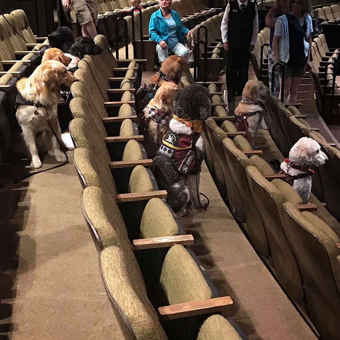 ▼這些狗狗來自服務犬訓練機構「K-9 Country Inn Working Service Dogs」。作為服務犬,牠們需要在任何聲音和光線下保持冷靜。到劇院聽音樂劇,對牠們來說是很常規的訓練。