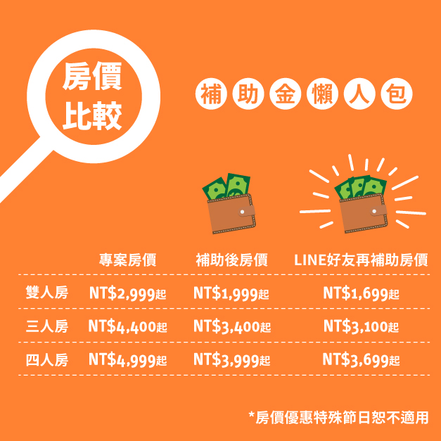 ▼以雙人房、四人房為例,住房折完1300元後,雙人房平均每人只要850元、四人房只要925元/人,1000有找;而三人房每人也只要1000元出頭,非常划算!