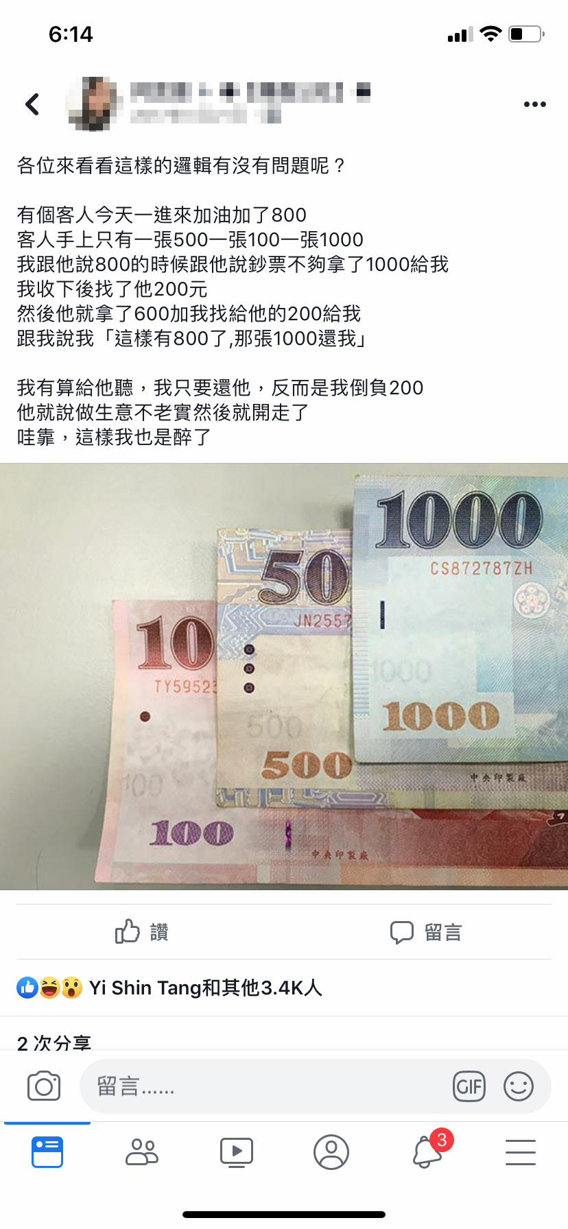 ▼數一數後,客人說「鈔票不夠」就把手上的1000塊給原PO,然後原PO當然就拿了200塊找給他。沒想到客人拿了200塊後,居然把手上的100塊和500塊連帶剛到手的200塊一起給原PO,還說「這樣就有800了,你把剛才的1000還我吧。」