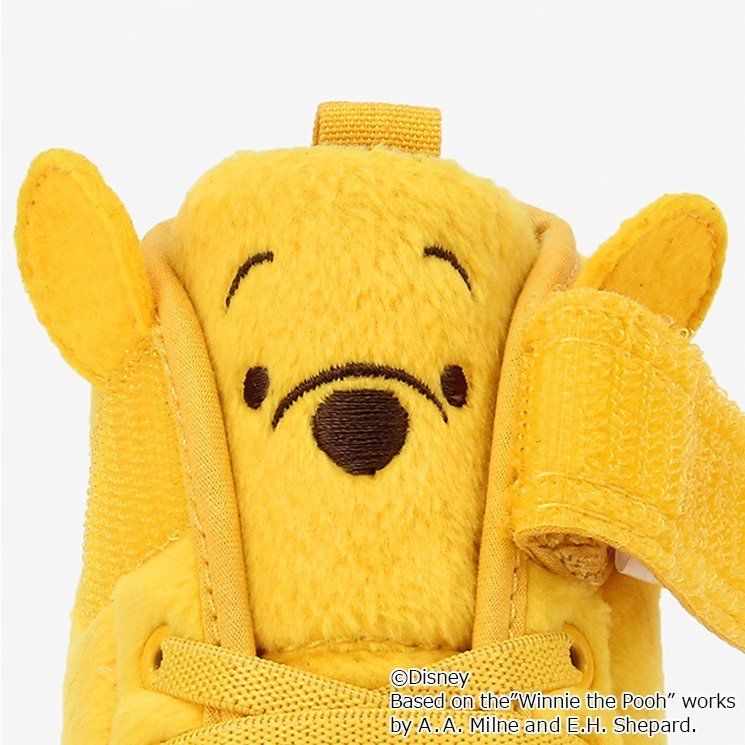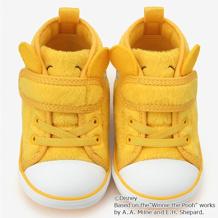 ▼最後一款「BABY ALL STAR N POOH FC V-1」才是大驚喜。這款鞋子整體做成了小熊維尼的代表色,黃色,而且材質毛茸茸的,超級舒服。