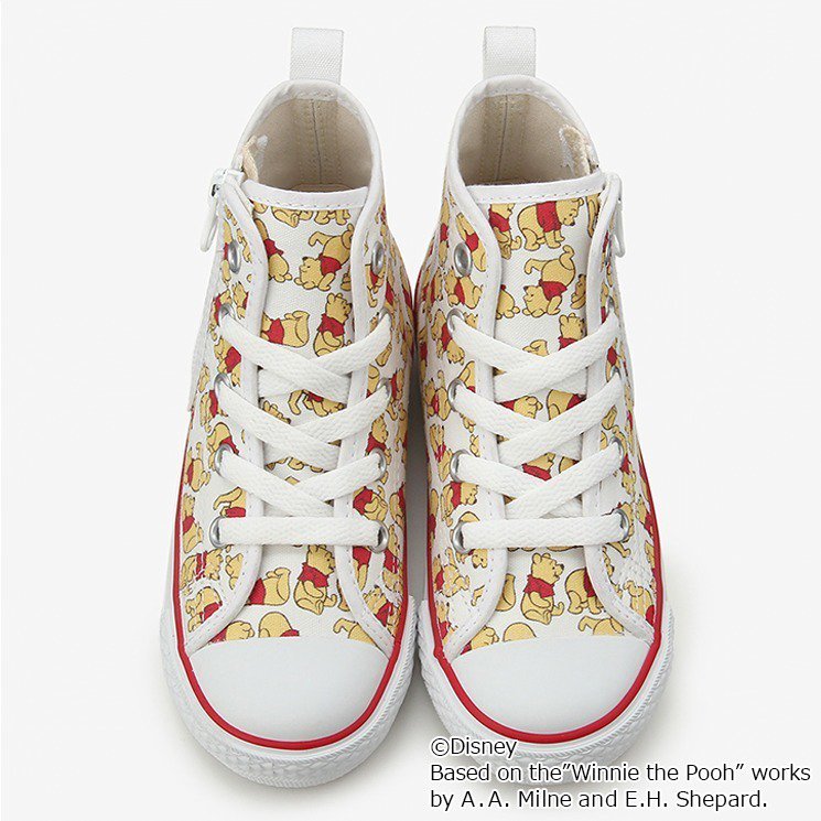 ▼首先來看看為「大小孩」設計的帆布鞋(日碼15-22cm)。這款「CHILD ALL STAR N POOH PT Z HI」採用All Star帆布鞋中經典的配色,白底+紅色線條,非常百搭。