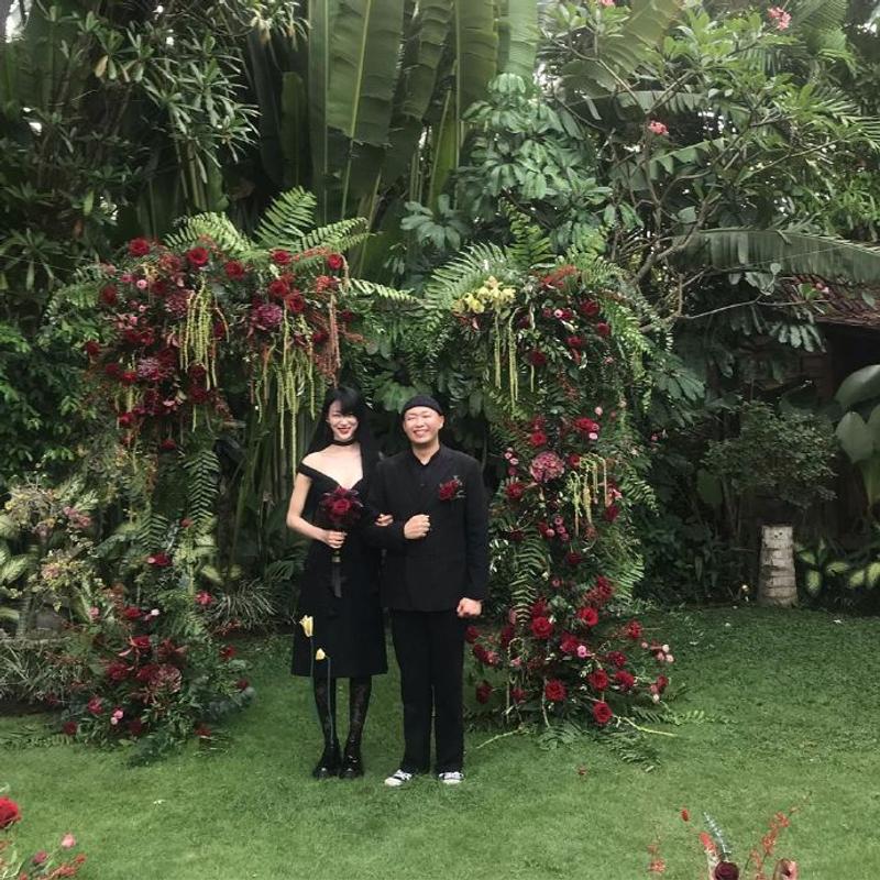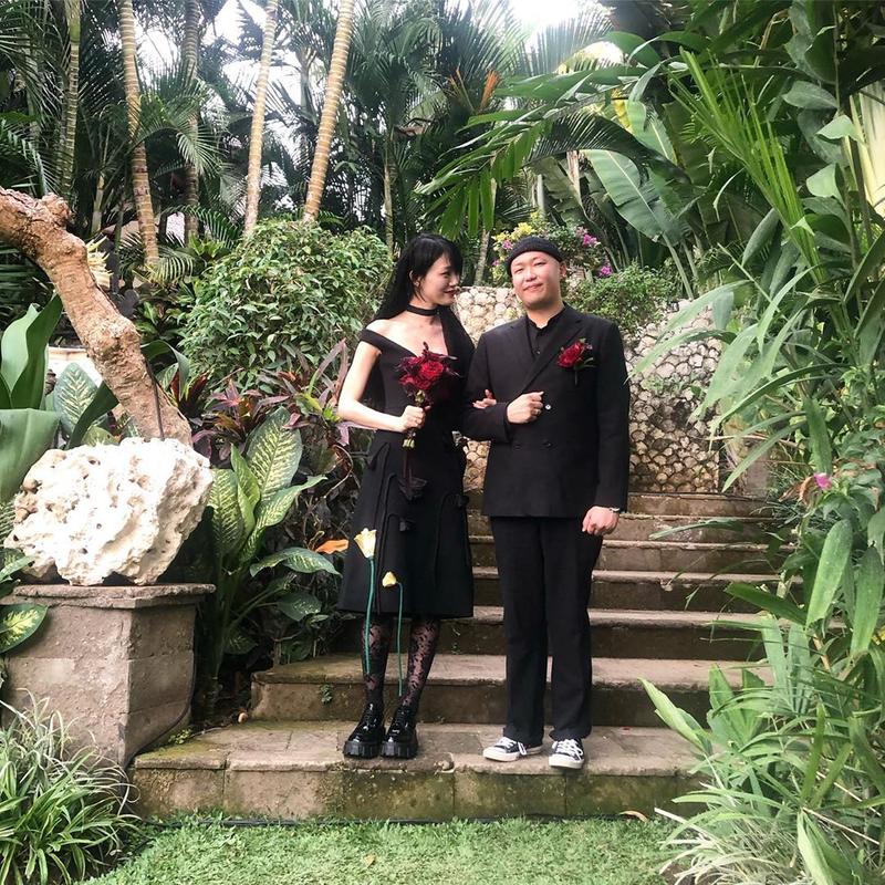 ▼不同於一般的婚禮上純白的婚紗,擁有超強個人風格的崔素拉選擇了黑色小禮服當婚紗,搭配頸鍊Choker和厚底短靴,連頭紗都是黑色的,將暗黑歌德風貫徹到底。新郎也是一身西裝,不過搭配帆布鞋,既莊重又不刻板。