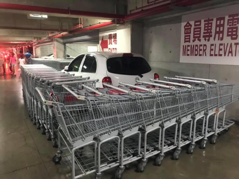 ▼根據原po發文所表示,事發處是新竹的一家大賣場,這輛白色的轎車將車子任意停在不是停車格的位置上,結果被賣場員工用手推車將車子團團圍了起來,讓原po大讚「你隨便停、我隨便圍,給店員無數讚」!