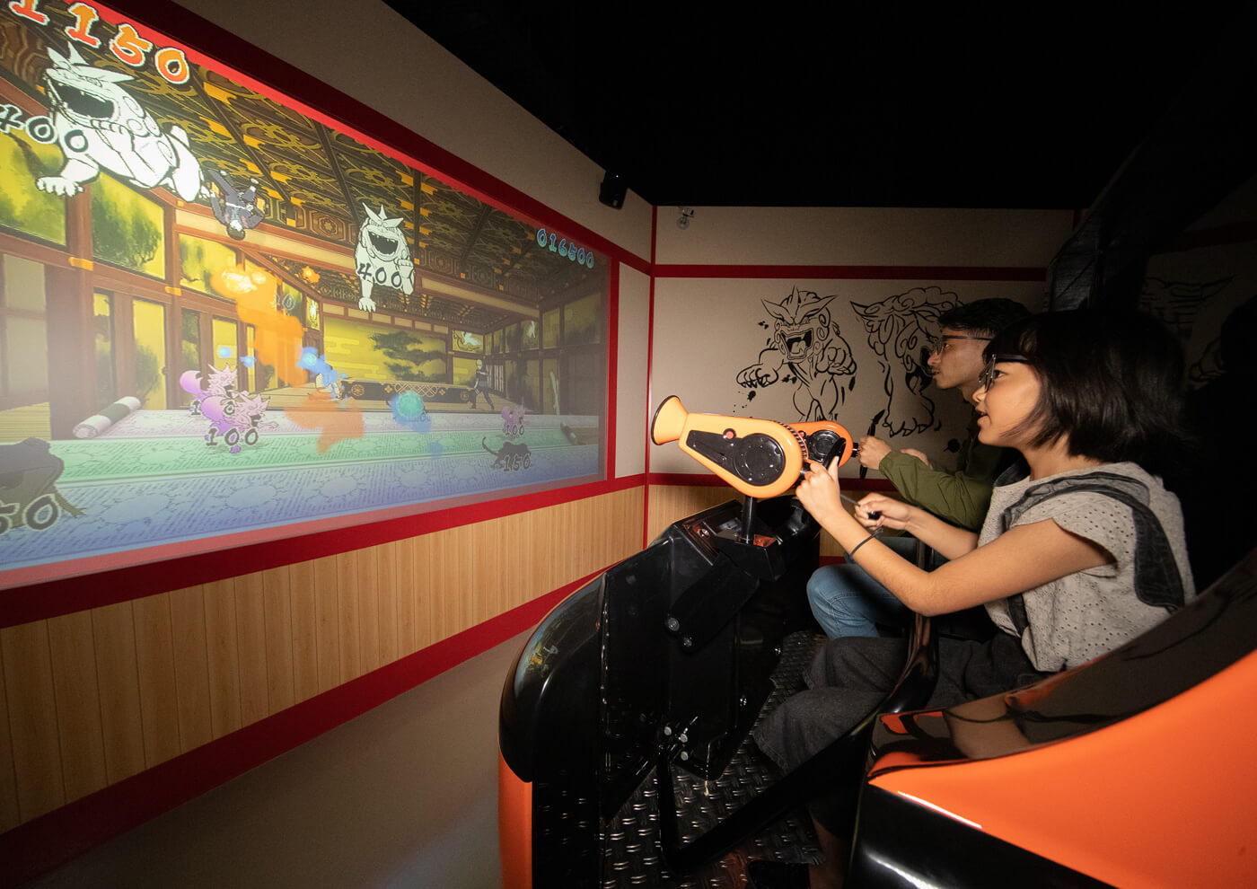 ▼1.科學忍具道場:戴上3D眼鏡、乘坐高科技忍具與忍者們對決,能一邊欣賞角色們的華麗忍術,一邊以高分為目標進行遊戲!