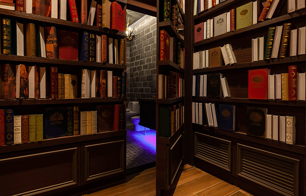 ▼而魔法世界中少不了的「密室」元素,在這間民宿中當然也沒有缺席。拉開偽裝成書櫃的暗門,門後竟是…洗手間XD。