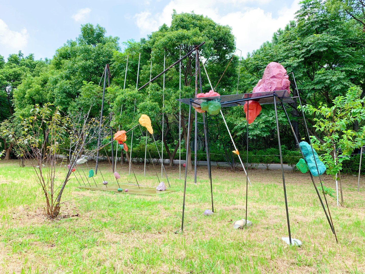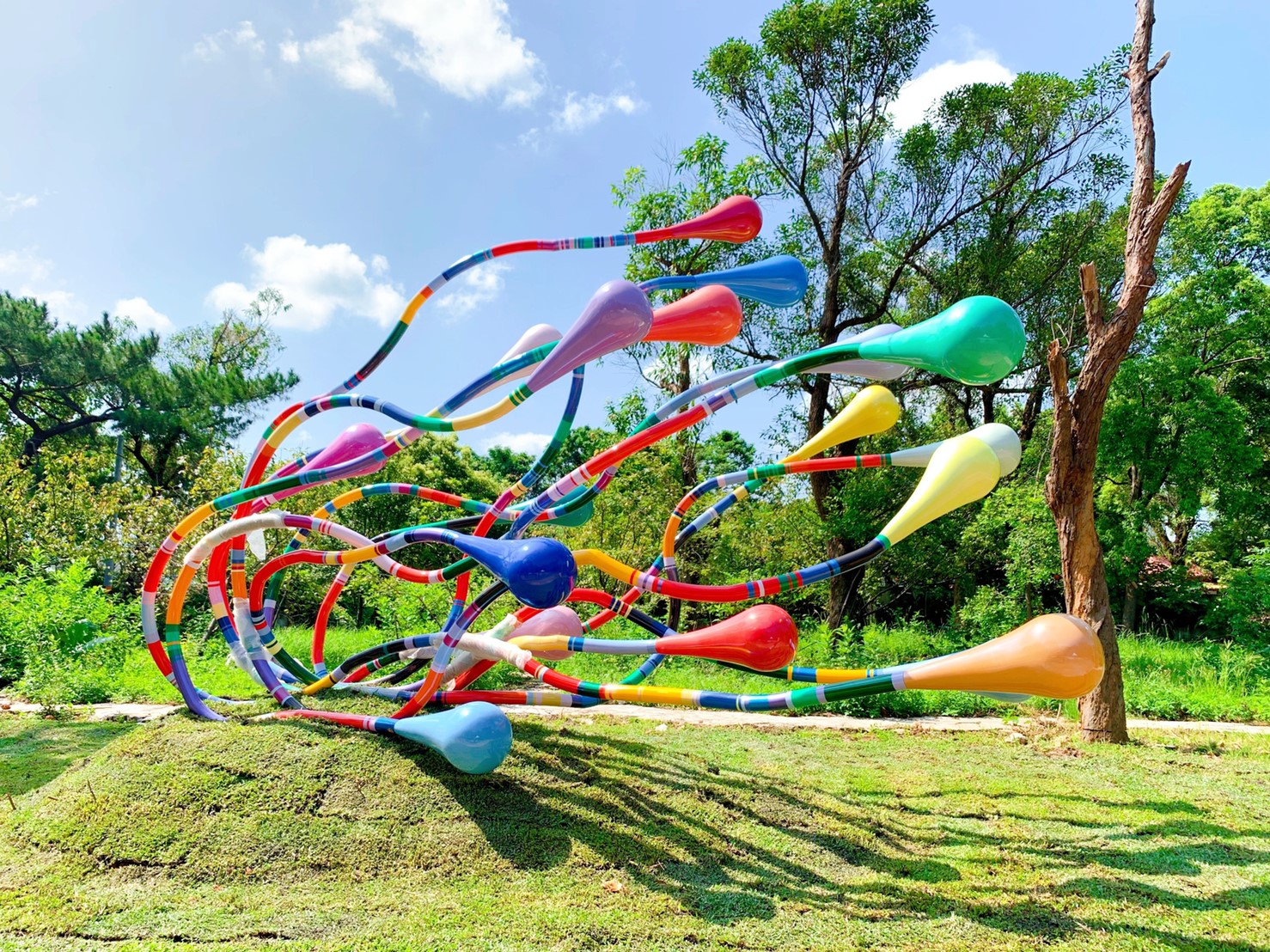 ▼桃園地景藝術節在各展區包含大湳森林公園、桃園市兒童美術館、西坡埤塘生態公園、溪濱公園、中大公園等地開展,在大湳森林公園,號召了國內外藝術家開展「現地創作」,共同思考此地歷經發展演化、長期累積而來的人文脈絡與深層紋理。而在桃園市兒童美術館,則取材童話異想,創造「糖果地景」,呈現親子同遊共享的都會空間。