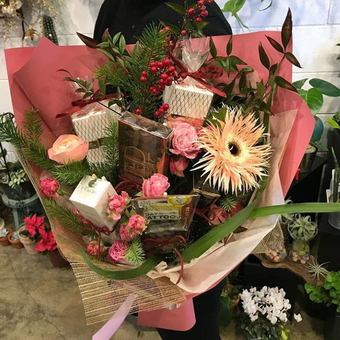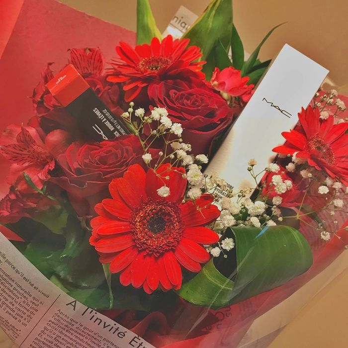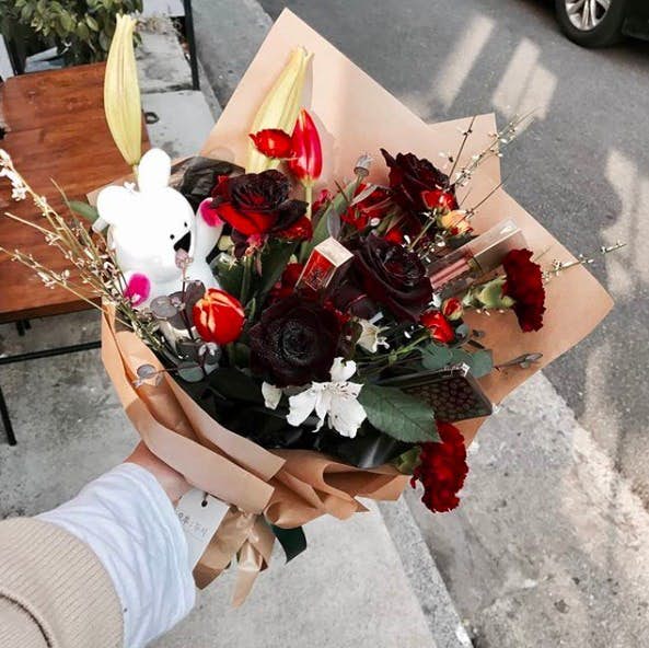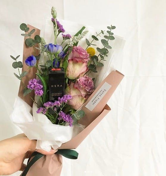 ▼韓國男生向來很會花心思哄女友,花束加上化妝品就是一個超厲害的搭配啦!