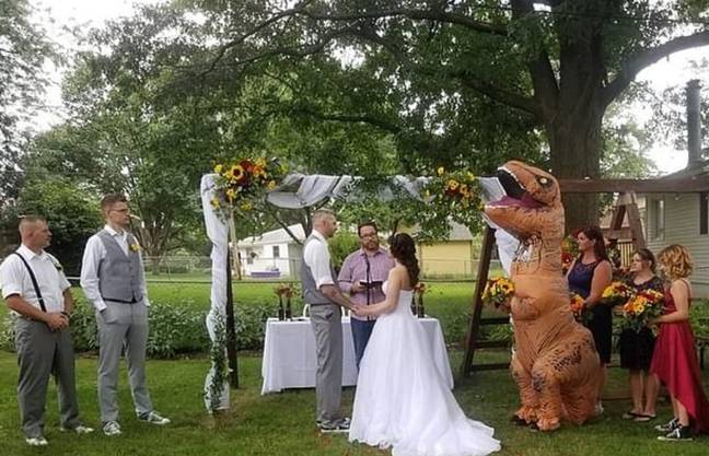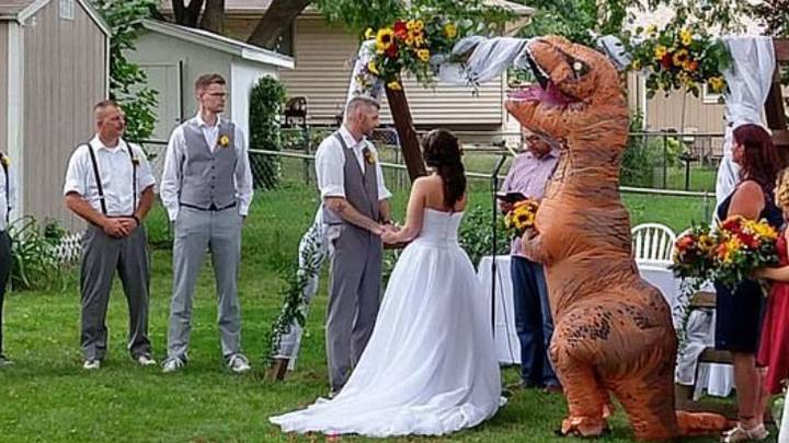 超幽默伴娘「穿恐龍裝」現身婚禮 新娘大笑支持:妳做得很好