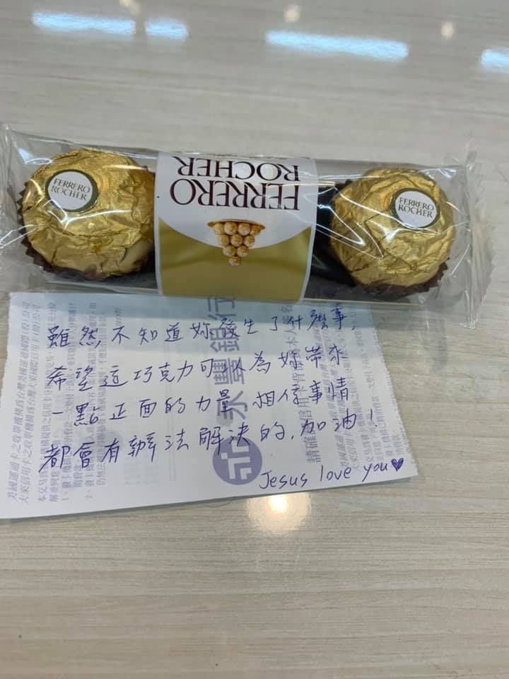 ▼原po在臉書社團中表示,自己近1個月來飽受男友的各種背叛行為,最後兩人還動起手來,自己才會躲到超商裡啜泣。當時有1名年輕女子看到原po這個模樣,默默的將一條金莎巧克力和一張紙條放在桌上後就轉身離開,紙條上的內容寫著:「雖然不知道妳發生了什麼事,但希望這巧克力可以為妳帶來一點正面的力量。相信事情都會有辦法解決的,加油!Jesus love you!」