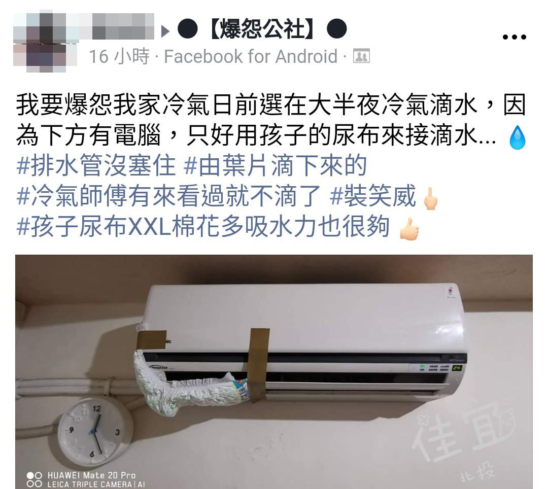 ▼原po就在臉書社團中表示,自己家冷氣下方就是電腦,卻突然在半夜開始滴水,讓她非常苦惱。這時候她突然靈機一動,拿出了寶寶用的尿布貼在滴水處,讓問題瞬間得到解決!