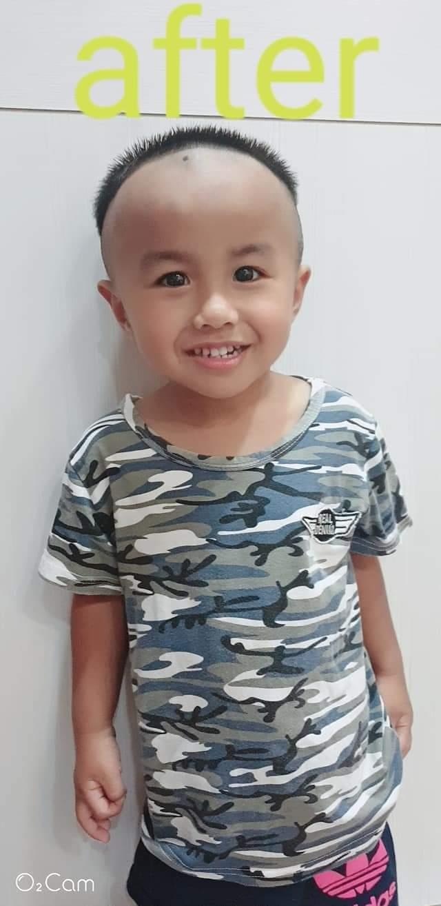 ▼結果,頭髮一被媽媽碰到之後…他彷彿穿越了時空,變成了清朝人啊~前半部完全光掉,只剩下後半部留了3公分左右的頭髮。剪完頭髮後,小男孩似乎很滿意(?),穿著藍色迷彩裝的他還可以對著鏡頭燦笑~