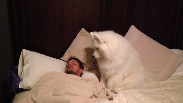 薩摩耶輕拍主人的胸口,溫柔的看著他的臉。主人醒來後不想馬上起床,牠又把涼涼的小鼻子貼在主人臉上。這樣的叫醒方式太溫柔了,不要說狗狗,就連家中的親人也做不到!