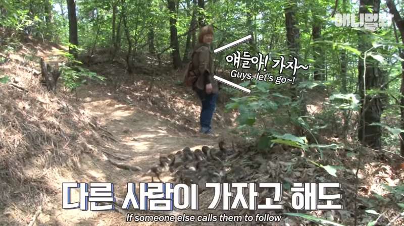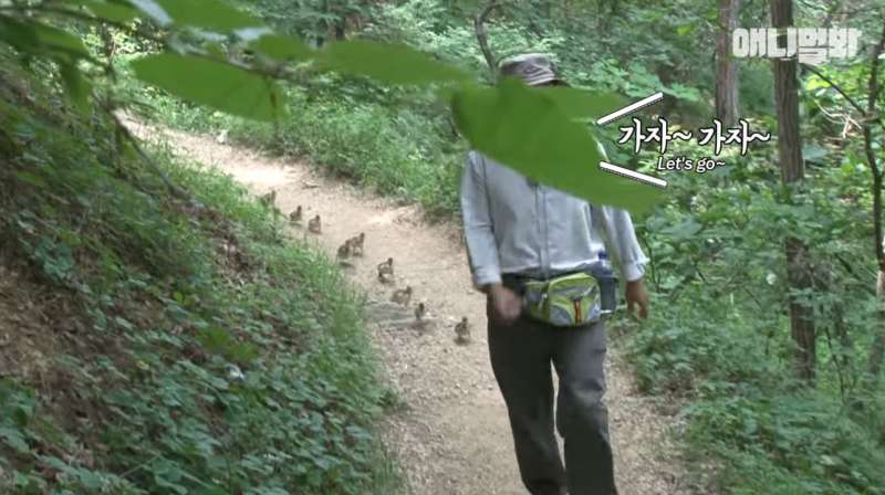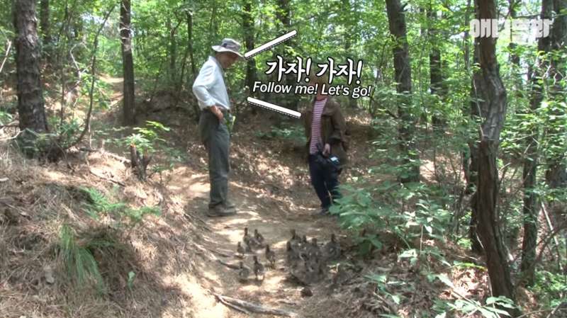 ▼為了讓沒有母親照顧的小鴨子們可以擁有健康的身體,他每天都會帶著小鴨子們到山裡散步健行。有趣的是,其他人的口令小鴨子們是完全不管的!