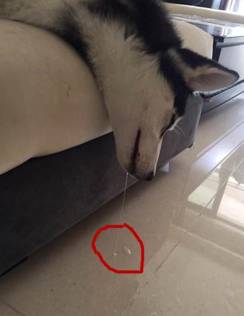 ▼月月睡到口水滴在地上,主人笑噴:「不要求你看家,但睡成這樣也太誇張啦。」