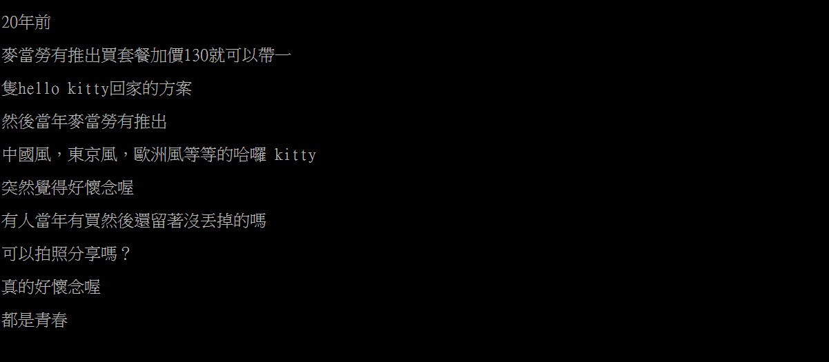 ▼原po在 PTT 發文表示,20年前的麥當勞曾經推出套餐加價就可以帶一隻凱蒂貓回家的方案,在當時掀起了一股每天都要吃麥當勞的風潮,不知道還有沒有網友記得當時的盛況?