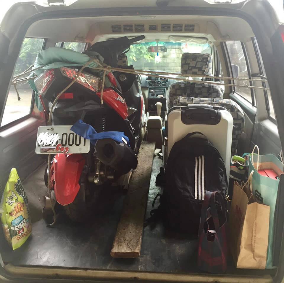 ▼不久後,整輛機車就將車子後車廂塞得滿滿的,爸爸還用一塊布將車身罩起來保護,旁邊就是有原PO的行李。「爸爸牌」的託運作業讓大家都直呼「這就是父母啊」!