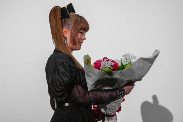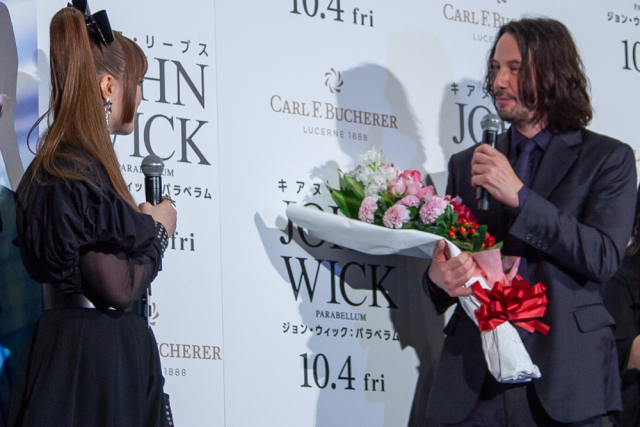 ▼卡莉怪妞在首映會上一出場就獻上鮮花,讓基努李維非常開心。