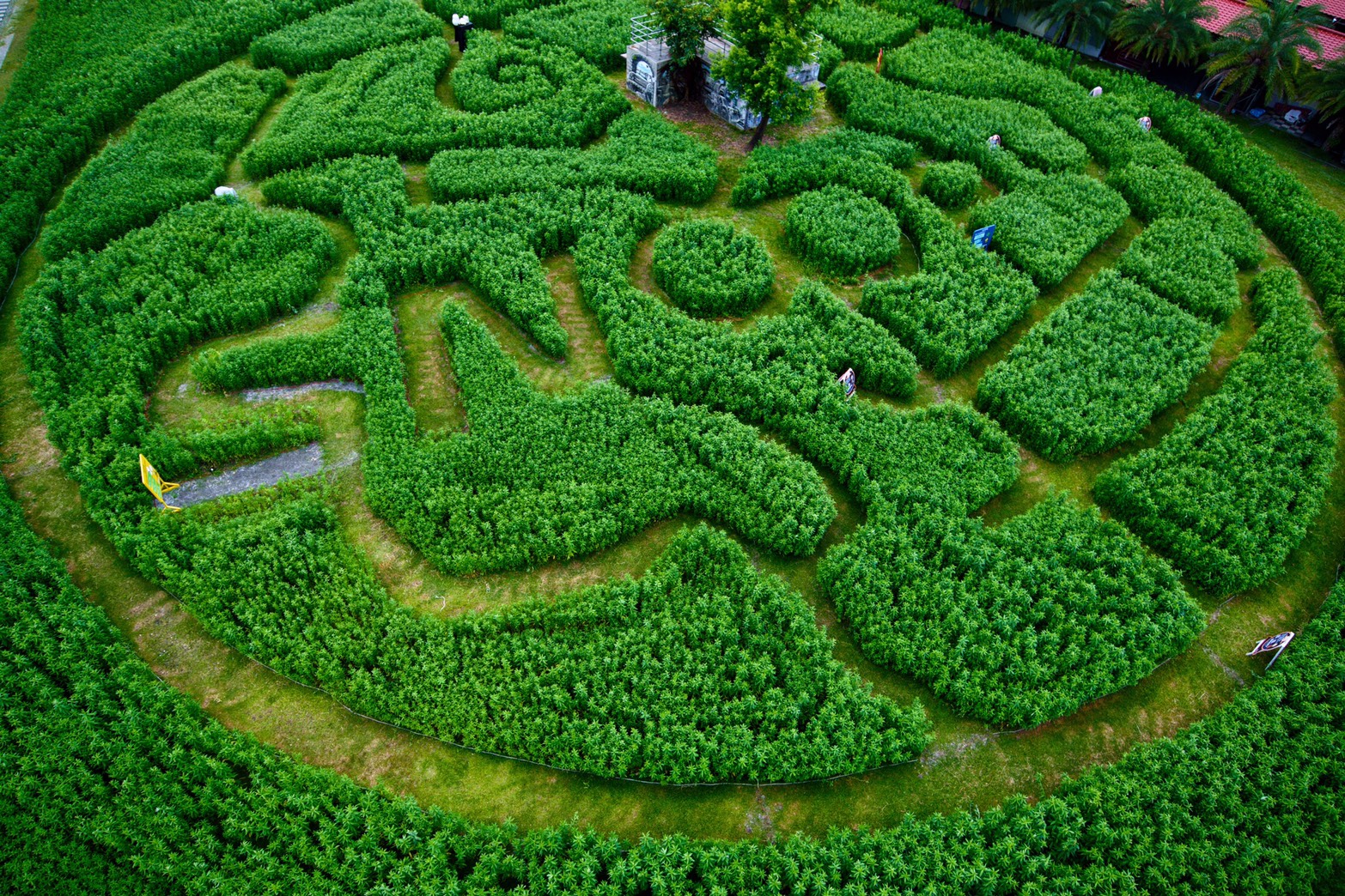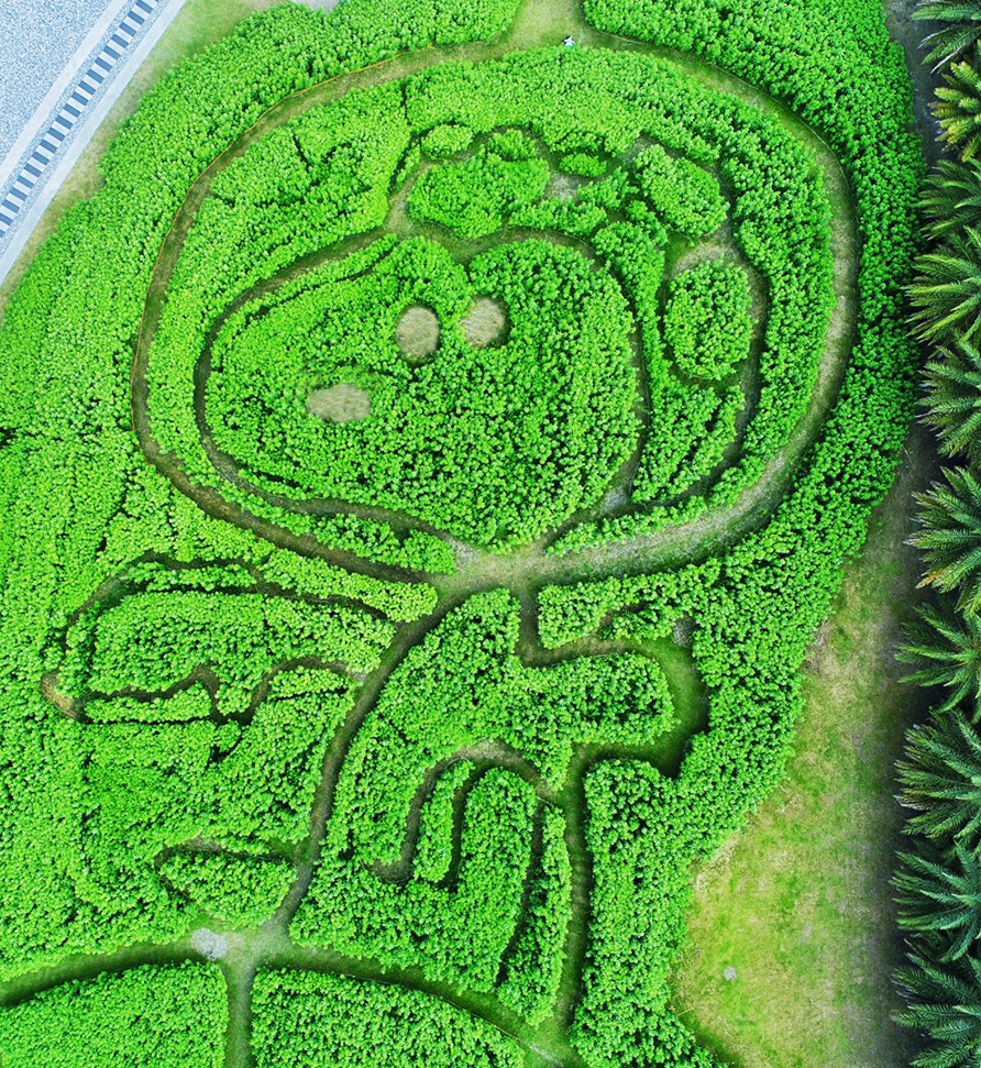 ▼花蓮「史努比迷宮探險」即日起開跑,呼應史努比今年的新主題「太空人」,慶祝人類登月50週年;佔地0.6公頃的超大迷宮,空拍起來就能見到太空人史努比的造型全貌。